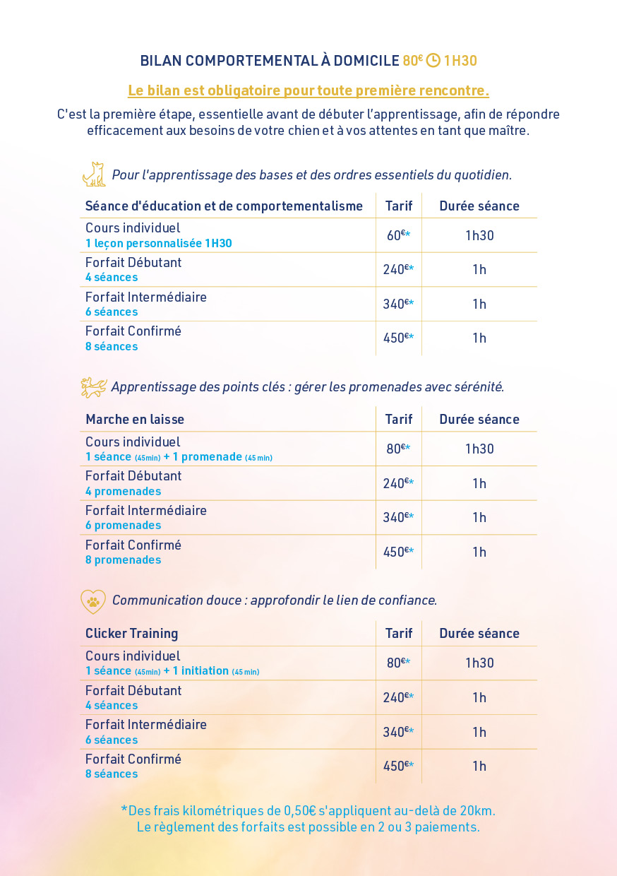 Séances personnalisées en éducation, comportement, marche en laisse et clicker training.